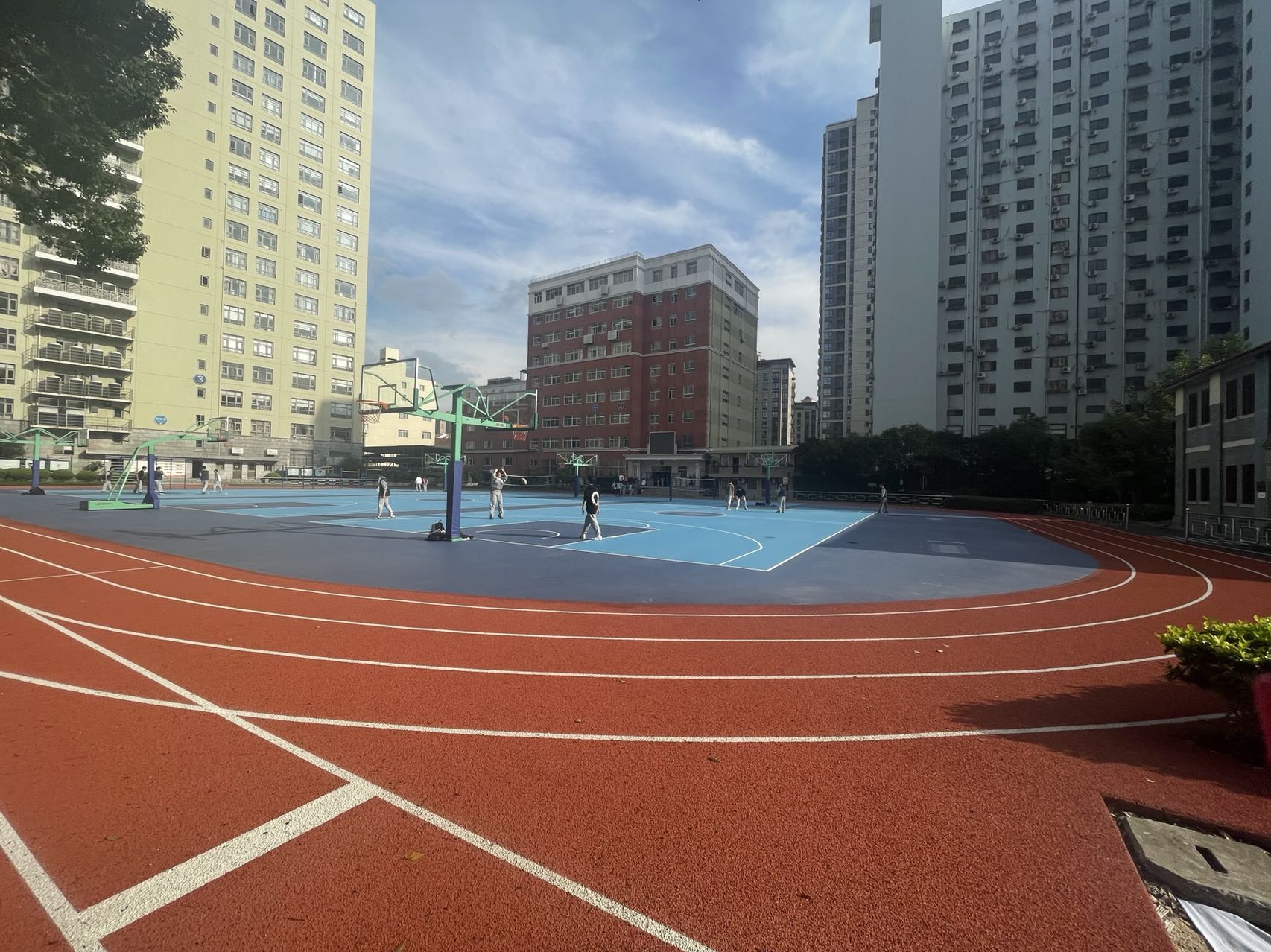 本工程位于上海市上海商業會計學校黃浦校區校內,為室外籃球場和塑膠跑道修繕工程,包括籃球場和器材區,總面積約3800㎡。